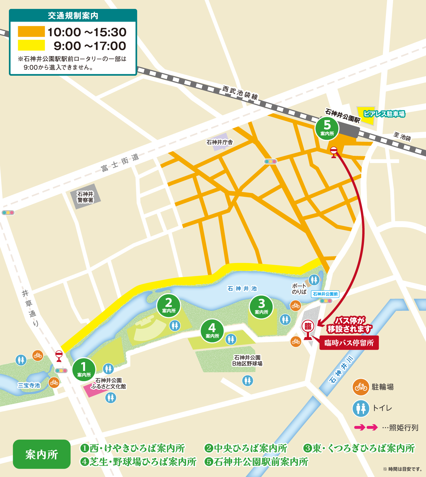 照姫まつり当日は、交通規制に対応するとともに、会場周辺の歩行者とバス運行の安全確保のために、石神井公園駅南口バス停留所の臨時移設を行います。